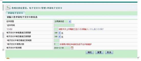 5.选择“电子支付卡”——“管理”——“申请电子支付卡”,选择“同意”,进入电子支付卡申请页面,如下: