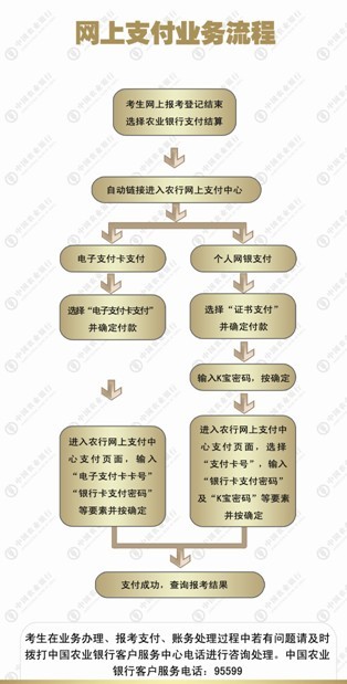 进行网上缴费的考生必须持有中国农业银行借记卡,通过电子支付卡方式或个人网上银行方式进行网上缴费。