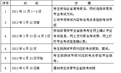 体育类考生须参加体育专业省统考,考试时间从2012年4月23日开始。