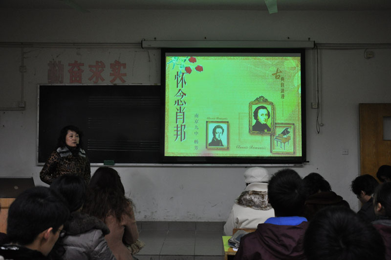 2012年2月21日上午,在南京市第九中学的音乐教室里,弥漫着浓厚的学术气息。由南京市语文教研室和音乐教研室举办的一次“《走向学科的融通》音乐语文同主题教学观摩活动”在这里举行。这次活动的同一主题是关于“钢琴诗人”肖邦,音乐课的课题是《怀念肖邦》由南京九中杨芳老师执教。杨芳老师的课重点从肖邦的音乐入手,启发学生从音乐的语言出发去欣赏感受作品,体会他的浪漫主义的诗意表达,了解他对钢琴音乐所做的杰出贡献和他的爱国主义的情怀。整节课丰富而简洁,老师的语言优美流畅,钢琴演奏技巧娴熟,展示出较强的教学基本功。音乐课后,南航附中姚雅丽老师接着给高一(1)班又上了一节题为《肖邦故园》语文课,老师和同学们的表现同样给我们留下了深刻美好的印象。“提倡学科综合”是新一轮课程改革的基本理念,这次活动的开展不仅给各位老师予启示,而且还开拓了老师们的思路,更使学生们有了许多收获。这是一次很有意义的活动。