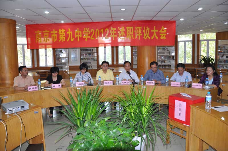 2012年9月19日下午,南京市第九中学2012年述职评议大会在九中校园内的学生阅览室召开。参会人员包括玄武区教育局工委书记陈发山、40位家长代表、玄武区政风行风监督员陈世群、区教育局行风评议联络员刘瑾、学校行风监督员、学校领导班子全体成员以及会议工作人员。会议首先听取了九中王伏才校长的述职报告。王校长对参加我校述职评议大会的领导、家长和行评员表示热烈欢迎,感谢大家对学校工作的关心和支持。王校长报告的题目为《全心全意为学生服务》,他从五个方面汇报了学校工作,包括:为学生健康服务、为学生进步服务、德艺双馨的教师为学生提供优质服务、学校文化滋润学生的精神成长、规范收费服务学生。他还向与会人员介绍了学校将开放课堂、设立校长接待日、完善校务公开制、加强教师专业化培训、精编精选作业等方面的措施。接下来玄武区政风行风监督员陈世群同志发放政风行风评议测评表,并在工作人员的帮助下,进行当场统计。学校方面则进一步面对面听取家长的意见和建议,令人鼓舞的是,各个年级发言的家长一致肯定了九中的办学理念好,办学目标准,办学成绩突出;高度评价了学校领导、年级部主任、全体教师的责任意识强、敬业精神好、教学水平高;教师廉洁自律,关怀学生身心成长。会议的第四项议程是由玄武区政风行风监督员陈世群同志宣布评议结果:南京九中评议满意率98.5%、比较满意率1.5%,总均分99.7。九中领导和教师以严守教育法规、规范的管理、严谨的工作态度、高效的教育教学成绩、高尚的师德赢得了社会、家长、学生的一致好评。最后王校长代表校领导班子表态:一定进一步加强与家长的沟通,及时解决好各种出现的问题,更好地为学生服务,促进九中学生健康成长,做人民满意的教师,办人民满意的教育。