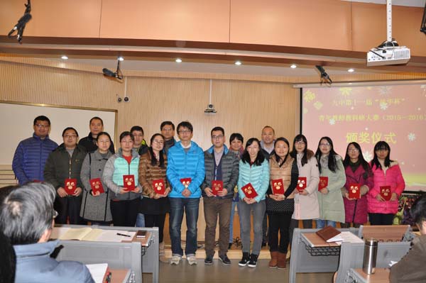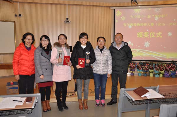 2016年1月6日下午,南京市第九中学隆重举行了第九届“风华杯”青年教师基本功大赛的颁奖仪式。九中诸谦副校长宣布了获奖教师名单,全体教研组长及评委为获奖老师颁奖。在大会上,张恒柱校长作了总结发言,他对此次大赛安排以及广大青年教师在大赛中的表现给予了充分肯定。同时对广大教师提出了殷切希望,希望广大青年教师要志存高远、脚踏实地,努力成为理念先进、知识渊博、教法灵活、深受学生爱戴的教育大家。