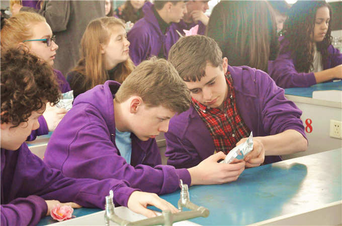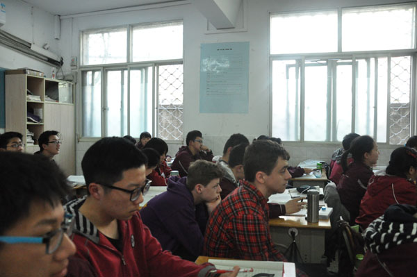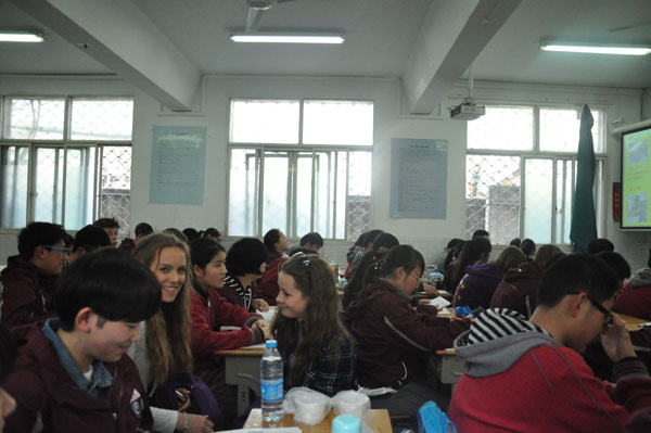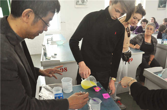 早在学生到学校访问之前,英方友好学校就建议要让他们的学生全程参与到中国学校的课堂中,体验中国孩子上课时的情况。因此,九中向英国友好学校全面开放了课堂,呈现了原生态的课堂模式。从欣赏语文古文、到参与政治哲学课,从复杂的数学逻辑推理到物理的繁杂公式推导,从信息技术的电脑操作到体育课堂的特色活动,这些都让英国学生有很高的热情参与。课堂上,有的老师还即兴用英语句子和英国学生交流,这让英国学生感到很惊奇。语言上的障碍并没有阻碍两国师生的交流,接待的志愿者和班上的孩子们一起用英语帮忙解释,课堂上始终洋溢着热烈的气氛。此外,学校还专门为他们安排了一节“如何制作手工皂“的手工课。化学组的方志开老师手把手地教,学生们认真地学。当学生们最后拿到自己亲手做出的肥皂是都很开心。
