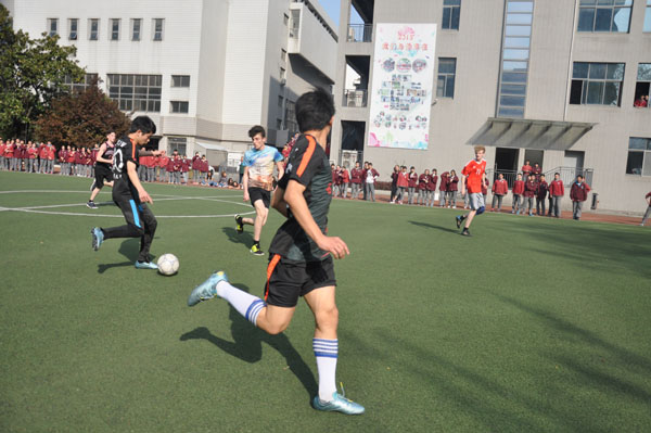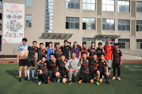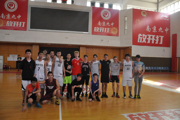 在2014年英国友好学校来访的时候,双方学生进行过一场篮球友谊赛。事过两年,两校学生的友谊赛从篮球扩展到足球。来自英国这个足球强国的学生们和以篮球见长的九中学生会给大家呈现出一场什么样的比赛呢?在大家的期待中,下午的篮球赛和足球赛如期举行。篮球场上你争我抢,九中学生果然在扣篮、三分、抢篮板上技高一筹,最终以较大比分取胜。在足球赛中,九中派出了刚刚在玄武区获得第一名的球员参赛,友好学校还是打篮球的原班人马。在上半场的比赛中,由于英国的同学们对场地、温度还不太适应,加之体力消耗比较大,没有破门机会。到了下半场,英方球员也慢慢适应了九中学生学生节奏,最后双方在40分中的比赛中以4:4握手言和。