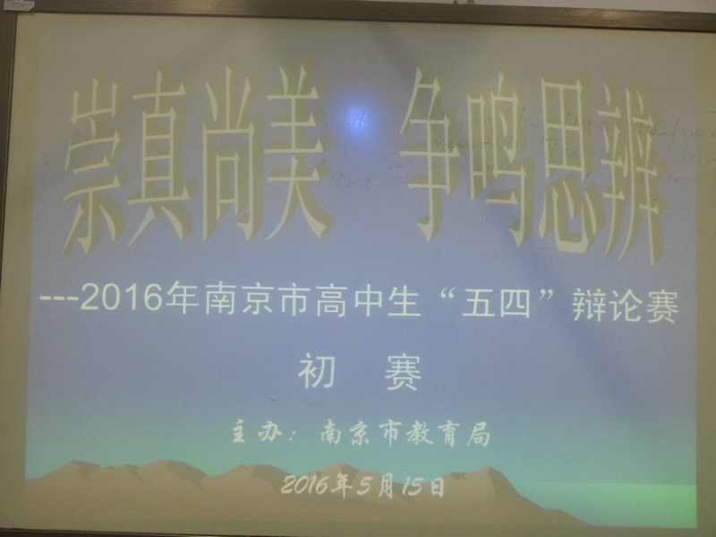 2016年5月15日下午14:30,正方南京九中代表队与反方高淳中学代表队在中华中学河西校区就“提高国民素质的关键是健全法律体系还是加强道德建设”这一辩题进行了“南京市五四辩论赛”初赛角逐。经过激烈的君子之战,南京九中夺得本场比赛的胜利,反方四辩成为本场最佳辩手。
