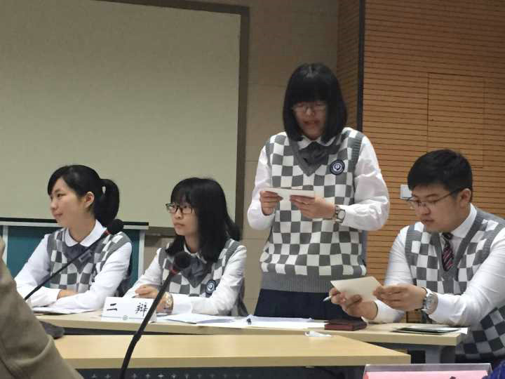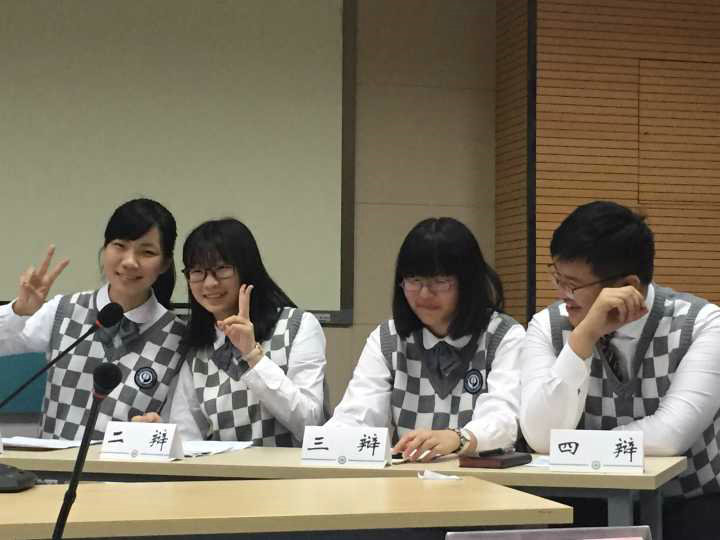 这一次我们的对手江浦高级中学辩论队的阵容不同往常,只派出了一员女将,其余三名皆为男生。比赛刚开始,唯一的女辩手以沉稳、优雅的辩风,熟练的脱稿陈词将我们带入了网约车优化市场秩序的美好世界,之后二辩三辩又对我方辩手在立论中提出的质疑做出机智回应,适时回避,使我方辩手处于精神高度集中状态,笔耕不辍。他们的发言有条不紊,列出一条条网约车发展带来的积极影响,三位辩手陈词时不受辩稿拘束,双手或做辅助动作或背在身后,十分洒脱。我方辩手也不示弱,沉着冷静,因经历了多次比赛的洗礼而掌握了一定的辩论技巧,将本次的进攻防守打得游刃有余,尤其是二三辩虽都是女将,在气势上却大有压过对方之势。而这样的气势绝不只是音调的抬高,更不是匹夫之勇,我方辩手据理力争,在自由辩论时多次将对方驳得哑口。双方不断抛出问题,我方辩手引诱对方说出对“冲击”这一观点有利的答案,再痛击之,形成了巧妙的连环问题组合。江浦中学代表队时间结束的铃声响起,我方仍剩余44秒,于是我方辩手借此趁胜追击,又向对方抛出更多犀利的问题。四辩金夏卿同学更是用慷慨激昂的总结陈词,再次强调本方立场,在强大的攻势面前,对方四辩出于无奈只好进行选择性回避,跳过一些棘手难答的问题而对本方观点做了最后的总结。