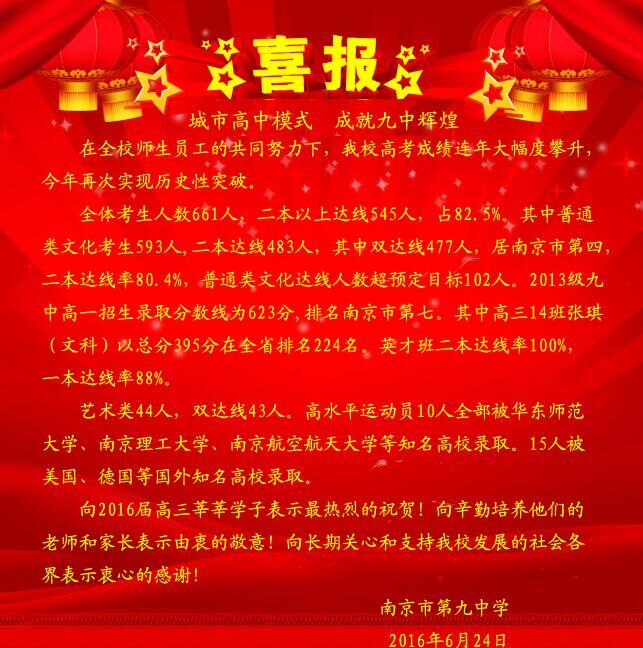 全体考生人数661人,二本以上达线545人,占82.5%。其中普通类文化考生593人,二本达线483人,其中双达线477人,居南京市第四,二本达线率80.4%,普通类文化达线人数超预定目标102人。2013级九中高一招生录取分数线为623分,排名南京市第七。其中高三14班张琪(文科)以总分395分在全省排名224名。英才班二本达线率100%,一本达线率88%。