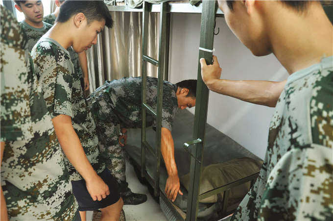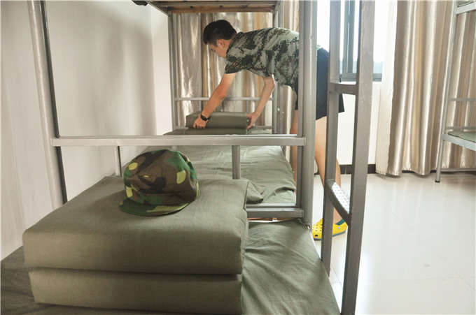 军训中,同学们的第一堂课便是内务整理。大多数同学是第一次离开父母,在外住宿,叠被子、整理床铺、打扫寝室卫生,对他们而言是一个个全新的挑战。在教官手把手地耐心指导下,同学们用心学习、反复尝试,终于叠出了一个个棱角分明的“豆腐块”,向教官、老师、父母,也向自己证明:我们长大了,我们能自立!