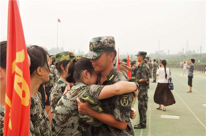 阅兵仪式结束后,教官们为同学们精心安排了一个温馨的退训仪式,在《送战友》的悠扬歌声中,各连队教官逐一为每位同学摘下军帽,向每位同学敬礼告别。虽然教官平时要求严格,但同学们都能够明白他们的苦心,体谅他们的辛苦,并早已与他们结下了深厚了情谊。当教官来到同学们面前时,有些同学回以军礼,有些同学拥抱致谢,更有些同学流下了依依不舍的泪水。