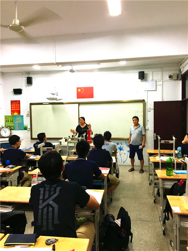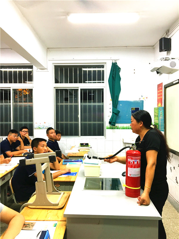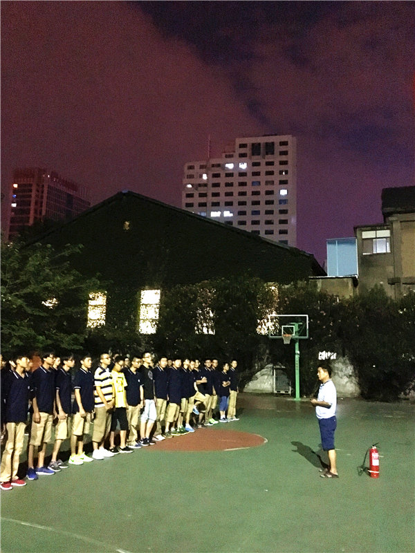 2016年9月4日晚,南京市第九中学安全科精心组织新高一年级的住校生进行消防演习。吴巧云老师、张杰老师等具体安排了此次演习。7点30分,全体高一住校生在听到宿管的火警信号后,从消防通道全速跑到操场集中。张杰老师在操场上进行火警警示教育并讲解灭火器的用法,还分别请同学们演练。