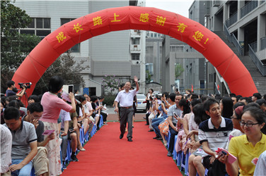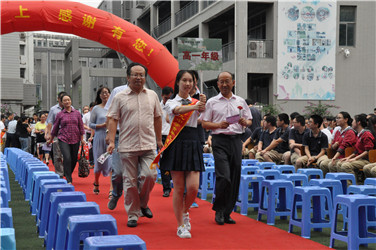 伴随着音乐,高一高二高三的老师们分别通过红地毯,随后行政老师们带着笑容入场,在全校师生的热烈掌声中,校领导们最后步入红毯。