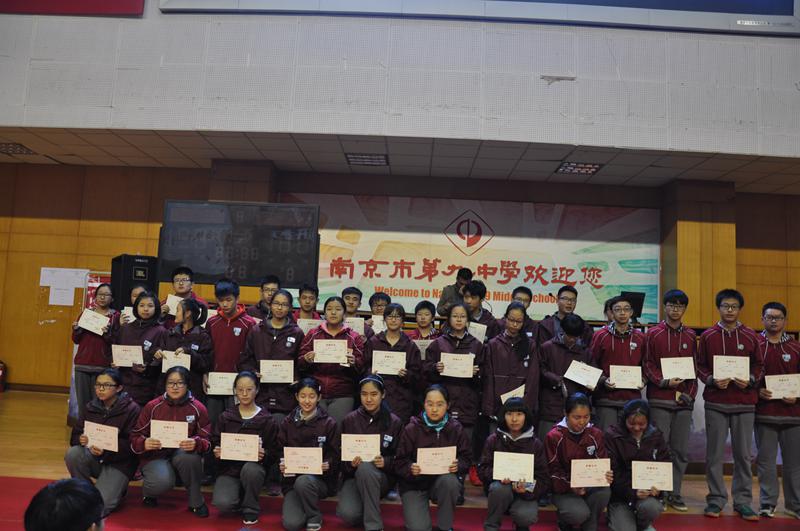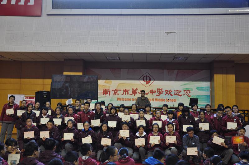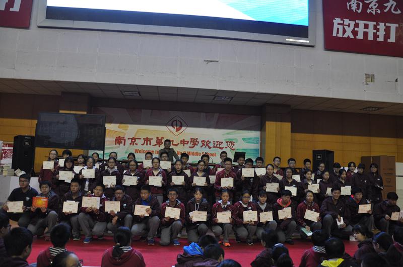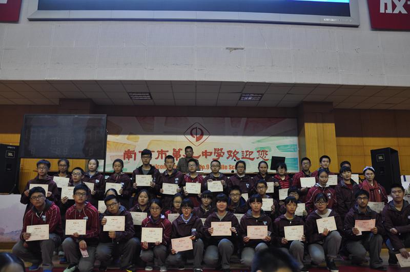2016年11月18日下午,南京九中高一六百余名学生齐聚体育馆三楼,召开期中考试总结大会。大会由高一年级部主任封平强老师主持,首先,年级组对本次期中考试语文、数学、英语三门成绩突出的同学进行了表彰,颁发了“精英奖”与“进步奖”,获奖同学上台领取了奖状与奖品,并合影留念。