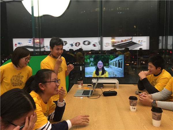 在苹果旗舰店的工作人员的带领下,同学们换上了“金灿灿”的苹果体验服,在工作人员的热烈欢迎中开始了一个半小时的体验活动。一开始,由工作人员为我们详细讲解了今天会使用到的两款软件的操作步骤,同学们快速的掌握了其中要领,接下来的时间里,10位同学分成了3组,选取了和地理课上刚学到的“天气系统”的知识为主题,分别进行了绿幕抠图的制作,在短短15分钟的时间里,3组同学们分工合作,顺利完成了3份不同风格的“天气预报”。值得一提的是,这3组天气预报风格各异,第一组,女生们选择了温柔甜美的播报风格,第二组,男生们用南京话接地气的进行讲述,第三组,以强烈的表现力赢得阵阵掌声。