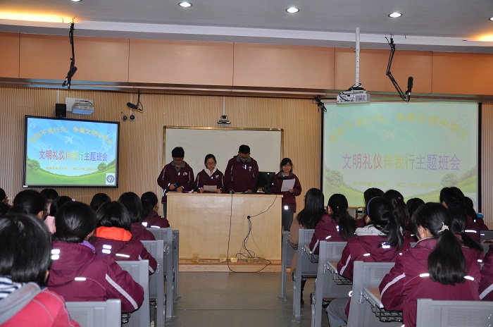 为营造文明礼貌、舒适优雅的校园文化环境,2016年11月30日下午,南京九中高二(17)班全体同学齐聚弘光楼106,开设了一节名为“文明礼仪伴我行”的主题班会,全体班主任们观摩了此次班会。