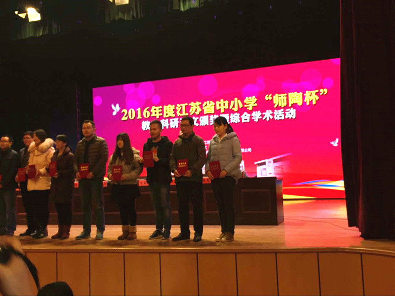 2016年江苏省中小学“师陶杯”教科研论文评比于近日揭晓,我校倪凤老师、吴昊老师、沈金花老师的论文在全省上交的近万篇有效论文中脱颖而出,分获特等奖、一等奖和二等奖。我校老师近年屡获“师陶杯”论文大赛特等奖。此外,特等奖获得者倪凤老师应邀赴江苏省海门中学参加颁奖典礼并开设主题研究课,倪老师此堂课教风亲和,教学扎实,内容形式结合完美,当堂解答学生疑问敏捷,师生互动的课堂,教学目标达成度高,获得听课专家和教师们的高度评价!