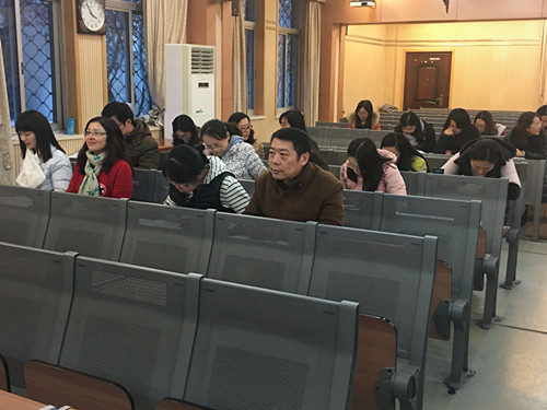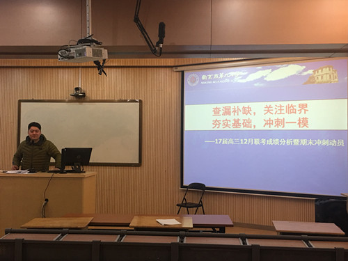 12月20日下午3时,在弘光楼106高三年级部召开12月联考成绩分析及期末冲刺动员会。首先,年级部吴昊主任通过具体的数据分析各科及各班在本次联考中的成绩,指出闪光点,表扬突出学科。其次,吴主任反馈学生学情调查问卷中提到的具体问题,并提出改进意见。然后,吴主任布置了学期末教学事务的系列安排,确保年级部所有活动顺利开展。最后,张恒柱校长代表校领导感谢高三全体教师的辛勤工作,鼓舞士气,祝2017届高三再铸辉煌。
