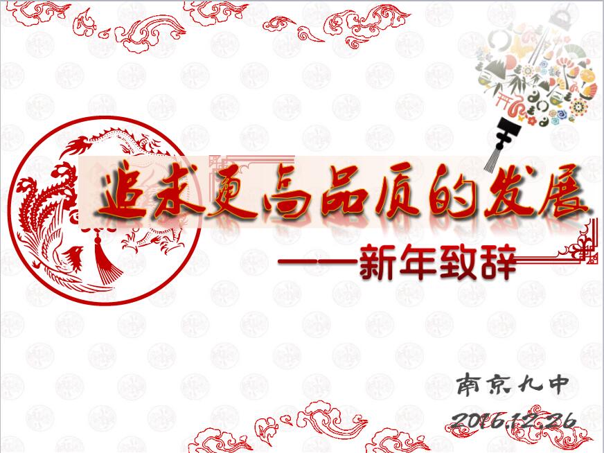 岁月荏苒,时光飞逝,转眼间,我们乘坐的青春号列车已将我们送到2016年的终点,站在岁末的站台上,2017年,满载梦想和希冀向我们款款走来。在这辞旧迎新的美好时刻, 我谨代表学校向全校师生员工、向世界各地的校友、向所有关心支持九中的朋友们致以最诚挚的问候和最美好的祝愿!
