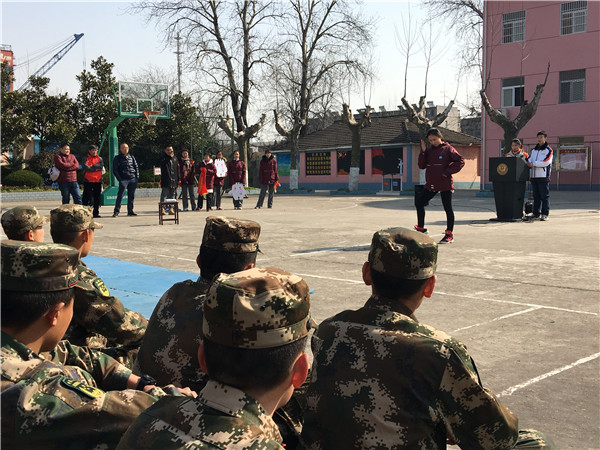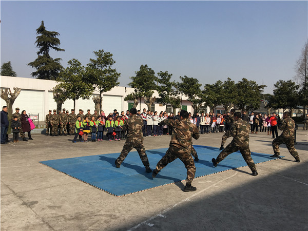 接着来到操场,观看战士们列队,走方阵和常规的搏击训练。战士们的精彩表现赢得了慰问师生的阵阵喝彩和一片欢呼。同学们的眼神中充满了仰慕与崇敬。
