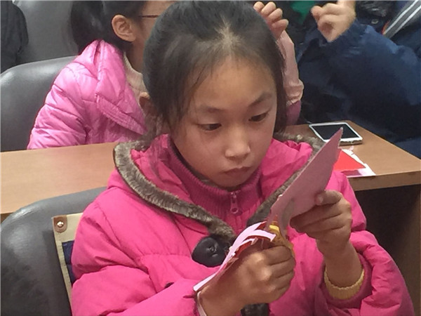 活动的主要内容是带领社区的孩子们做手工、游戏互动。18日,同学们早早到达了活动地点,进行精心的布置。孩子到齐后,首先通过图文并茂的PPT向他们介绍了剪纸的来历和特点,并播放了一则有关剪纸艺术的视频。在同学们的帮助指导下,孩子们用自己灵巧的双手剪出了许多美丽的作品:花朵,动物,“福”字……应有尽有。大家互相帮助着,在欢声笑语中度过了这段美好时光。