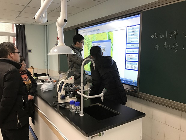 2017年02月21日下午15:00,2016-2017学年度南京市第九中学生物教研组在全新落成的生化数字实验室举行教研活动。本次活动主要是熟悉化实验室新系统新设备。首先是黎师傅为我们讲解新系统的操作,其次是付师傅为我们介绍双筒显微镜使用的注意事项,最后是解师傅为我们演示传感器的使用。此外,来自苏威尔公司的李女士详细的为我们介绍了针对高中生物试验中涉及到传感器的实验的应用。大家在兴趣盎然中表示收获颇丰。最后杨培红老师总结:这次培训对九中的生物教学改进具有重要意义,对生物校本课程的开展提供新的思路。