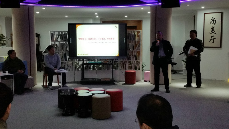 最后在文艺楼的尚美厅,高三年级部主任吴昊老师向代表团介绍了九中17届高三年级在教育教学中的经验和心得体会。吴昊主任从目标引领,人文关怀,深度学习和过程监控四个方面介绍了目前高三年级的做法,并与来访的老师们进行了沟通和交流。