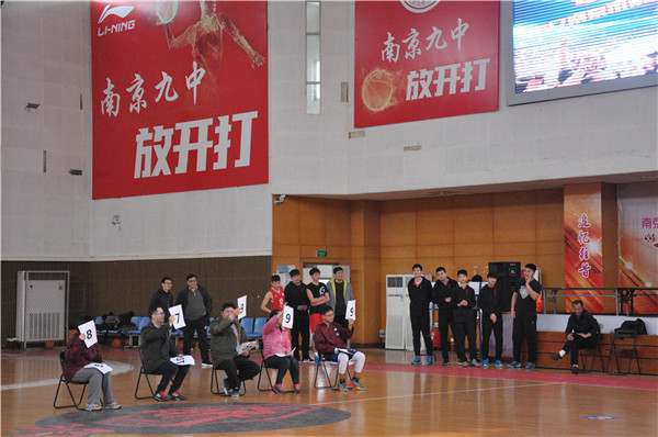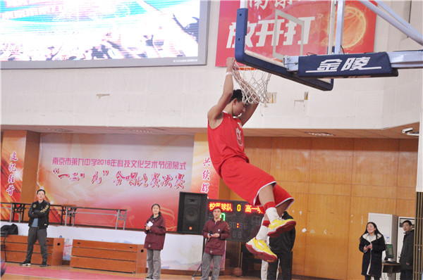 接下来,南京市第九中学校篮球队的队员又为我们带来了精彩的扣篮表演。两位同学评委和三位教师评委,共同参与评分,令比赛更具有观赏性。同学们被这一场热血沸腾的扣篮赛深深震撼,赛场上响起了经久不息的掌声。