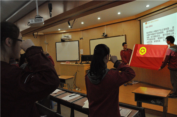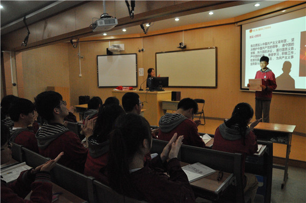 主题团课中,团委张瑞寒老师首先介绍了本次团课的重要意义和作用,对出席的各位团支书进行了近期志愿服务活动任务的说明。要求团支部书记要加强自我管理和自我要求,做一名合格的团员。随后,张瑞寒老师带领各班团支书重温入团誓词,在“五四青年节”来临之际唱响团歌,鼓励各位团支部书记做好接下来的工作,积极创建活力团支部。最后隆重表彰高二18班团支部,在2016年度江苏省大中专学校“魅力团支书、活力团支部”风采展示评选中被评为“活力团支部”。