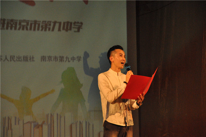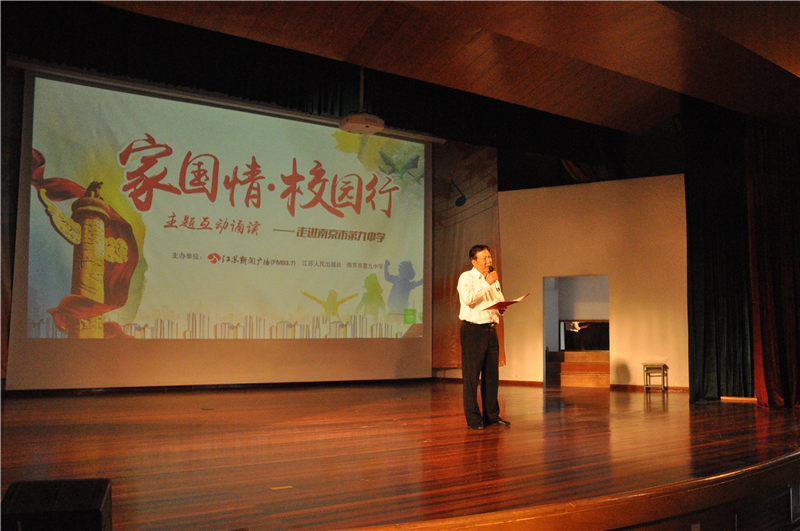 4月28日下午,江苏新闻广播、江苏人民出版社和南京市第九中学共同举办的“家国情、校园行”主题诵读活动在九中文艺楼三楼演出厅举行。朗诵会由省朗诵协会会员、国家“金话筒”获得者姜林杉主持,南京九中张恒柱校长、德育处王艳飞主任等出席了本次活动。