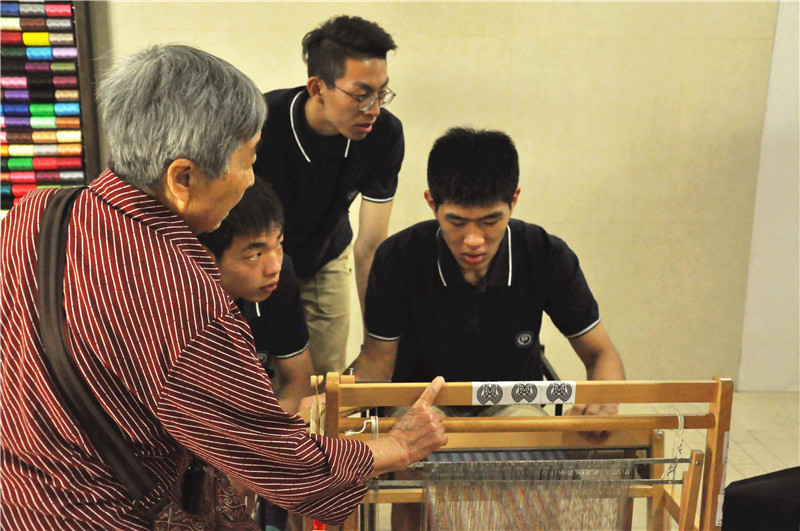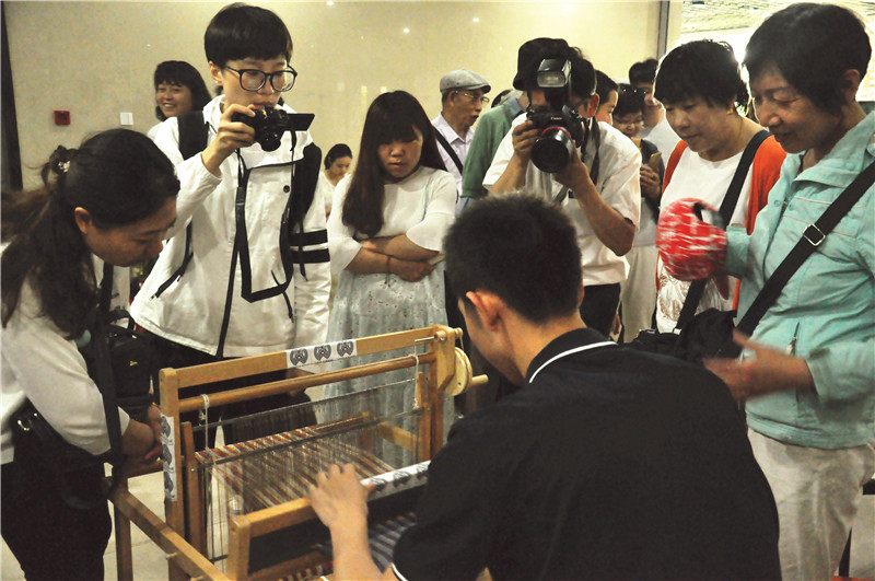5月18日是世界博物馆日,江宁织造博物馆邀请南京九中学子参与南京云锦“织染小学堂”主题社教活动,向市民展示织布机的操作过程。