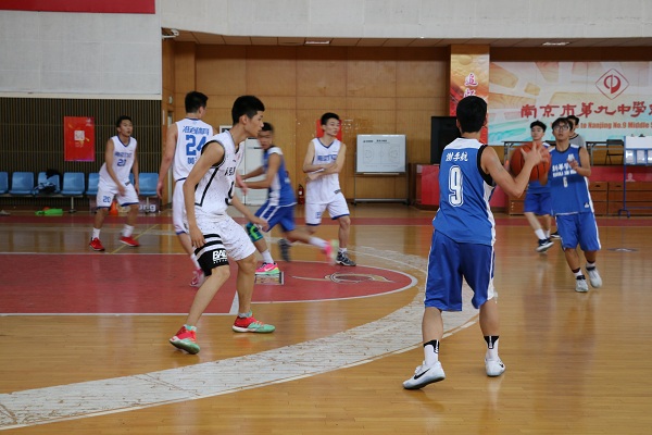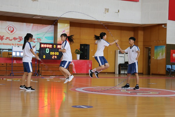 13日清晨,访问团抵达九中。校长张恒柱、副校长诸谦、校办副主任李菊平参加了欢迎仪式。张校长对学校的历史、办学业绩、办学特色进行了简介。新华学校的领队林诗敏老师也介绍了新华学校的基本情况。简短的欢迎仪式之后,澳门的学生分别参加了九中学生的大课间跑操、语文文学赏析课、趣味体育活动课、参观九中学生食堂。午后,访问团在专业讲解员的带领下参观了九中附近的江宁织造博物馆和六朝博物馆。参观完之后,九中的舞团、截拳道、汉服社三个社团进行了精彩的社团展示,来访的学生也带来了高水平的花式跳绳表演。当天最让大家难忘的是两个学校高水平的篮球赛,双方球员全力以赴,不断打出专业运动员的水准,给大家呈现了一场视觉盛宴。