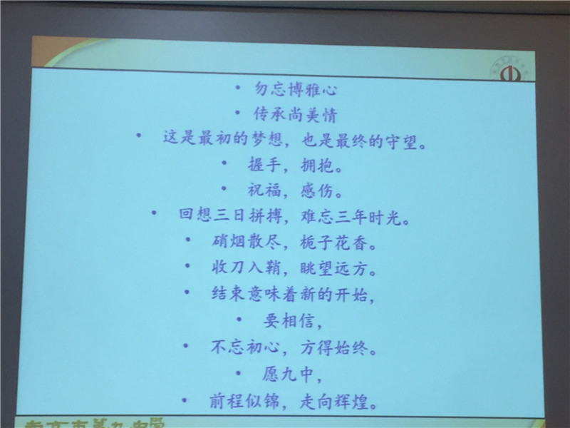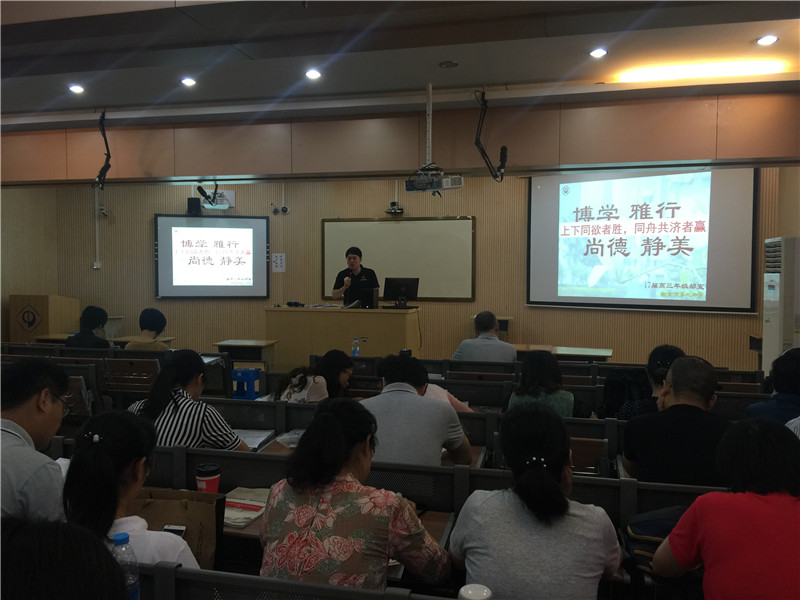 第一篇章:年级部战略。2017届高三年级部主任吴昊展示了他在高三一年中抓拍的大量鲜活的照片带领我们再一次领略回味了高三这一年师生们团结奋斗的历程,从中可以充分体会到:本届高三教育教学工作成绩的取得与我校先进的办学理念和办学模式是密不可分的,城市高中模式成就了九中辉煌;与2017届优秀的教师团队以及教师们高超的教育教学水平、艰苦奋斗的作风、乐于奉献的精神密不可分的;与年级部“全面、全员、细致、精致”的管理理念密不可分;与在全体高三学生中倡导的“博学、雅行、尚德、静美”和学干队伍自始至终的自我管理密不可分;正所谓“上下同欲,凝神聚气;随机应变,稳中求胜”。当然,吴昊主任也对2017届的工作做了非常好的反思,为2018届高三提供了非常宝贵的建议和启示。吴昊主任还与大家分享了五句箴言,并以他创作的小诗作为结语。