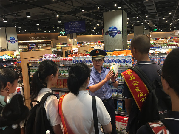 仪式结束后,同学们开始了第一个活动,来到了绿地进口超市。超市里摆满了进口商品。玄武门分局投诉举报站站长程路向同学们介绍购买预包装食品应当注意的问题。同学们都听得十分认真,学习到了如何辨别预包装食品是否安全的方法。