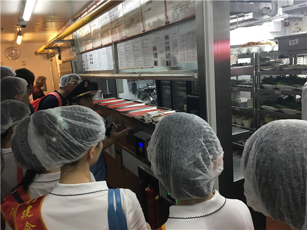 第二个活动是在海底捞进行的。由玄武门分局食品科宋科长向同学们了介绍餐饮企业检查流程、比如公示牌、后场情况。当得知要进入海底捞后场的时候,同学们都很好奇,一般情况下后场是不允许顾客进入的。进入后场之前,同学们戴上了工作人员准备的帽子,防止头发掉入到菜品之中。在后场里,工作人员向同学们介绍了各个工作间的作用,同学们也亲眼见到了工作的流程。这让同学们进一步的了解到了食品安全的重要性。