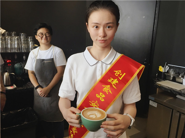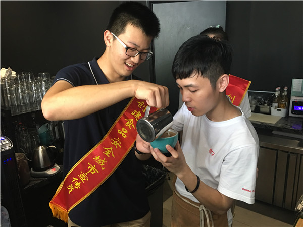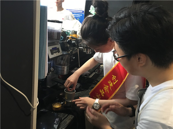 接着,同学们来到了UNIUNI咖啡店。店里虽然不怎么凉快,但是浓郁的咖啡香气让同学们忘记了炎热的天气。店长向九中的同学们介绍了咖啡的种类,还有两名对咖啡制作感兴趣的同学去亲手尝试了做咖啡。他们仔细看了店长的示范,在店长的指导下完成了属于自己的一杯咖啡。