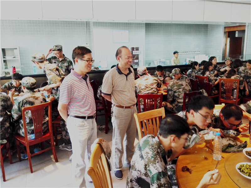 8月7日上午,南京市第九中学校长张恒柱、校长助理桑小兵、王艳飞、总务处副主任郭成等一行来到国防训练基地看望正在这里军训的2017级高一全体师生。