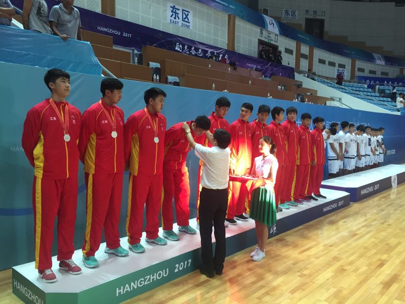 当天下午四点,在杭州举行的中运会男子篮球决赛中,代表江苏省出征的九中男篮在两名主力队员受伤的情况下拼尽全力,最终不敌广东队,屈居亚军,这也是近几年江苏代表队在中运会的最好成绩。