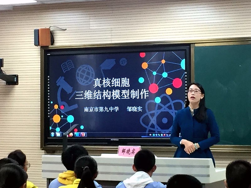 2017年10月17日,议程第三日,特邀南京市第九中学生物教研组教师邹晓实老师在高一年级开设«真核细胞三维结构模型制作»示范课,并邀请上届省培训班班长,南京九中生物教研组组长杨培红老师做教后评课。