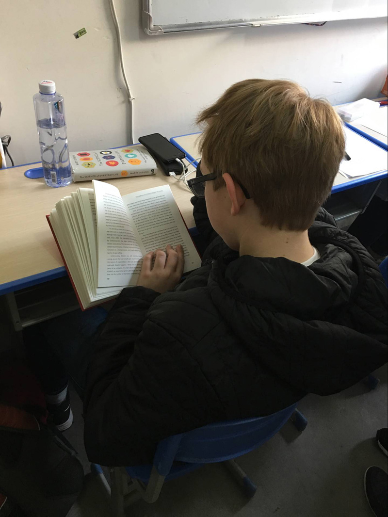 看学霸中学的学生就是为利用时间,出去玩也带着书,一点点等待的时间,就把书拿出来看了。
