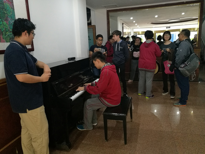 每天,同学们喜欢午饭后休息时间来弹首随意的钢琴曲,或者唱上一段,看,我们同学优美的歌声琴声把英国学生都吸引出来了。