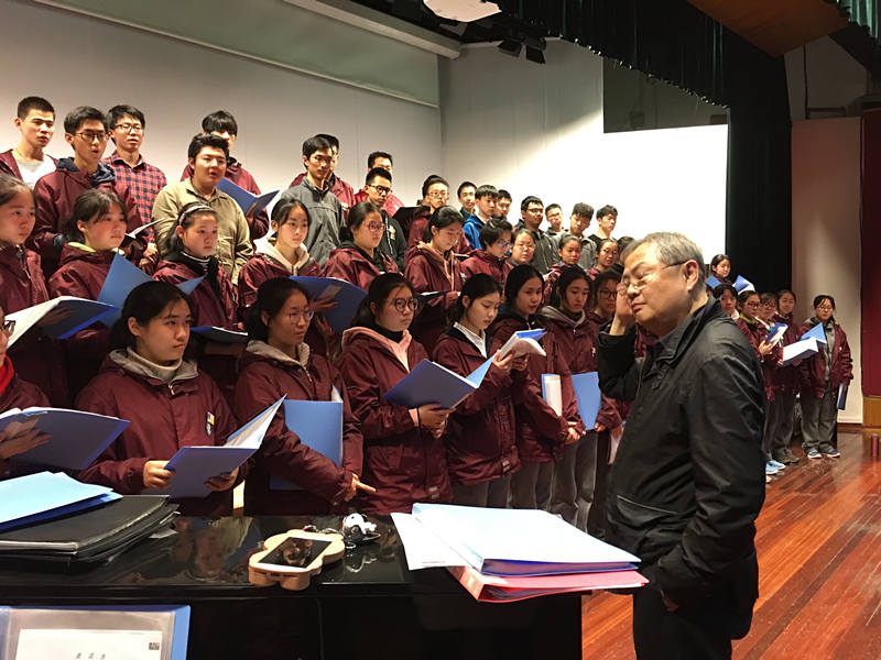 赵老师对九中合唱团的两首参赛作品《卖花生》与《城南送别》进行了细致入微的指导。对于菲律宾民歌《卖花生》,赵老师指出歌曲在速度上的处理可以再流动一些,并且一定要注意乐句之间的连贯与音乐的朴素性,严格按照乐谱上的时值演唱,尊重原谱。而中国作品《城南送别》,赵老师强调合唱团的整体音色应与钢琴伴奏保持一致,注重歌曲的意境与表现的情感,对音色与和声做了相当细致的指导。