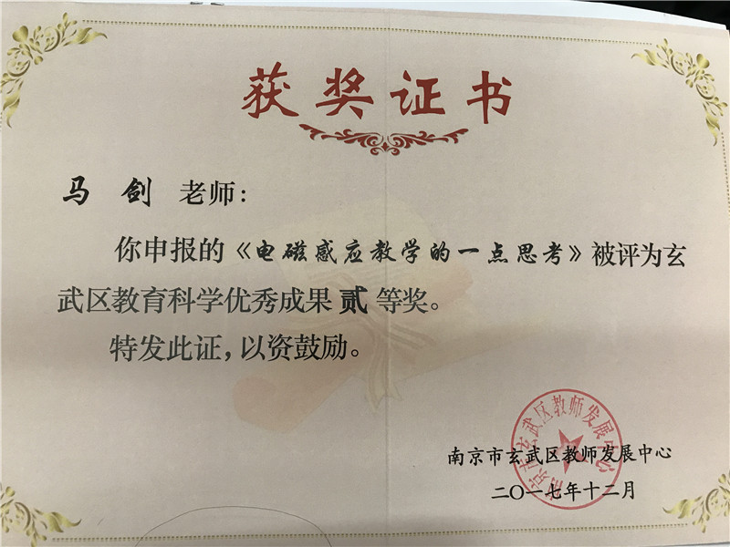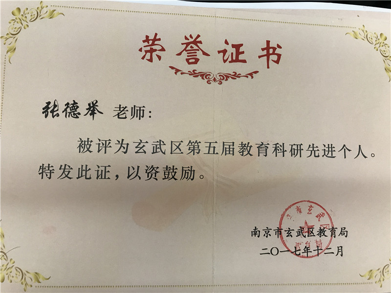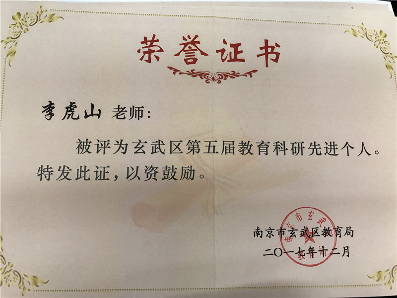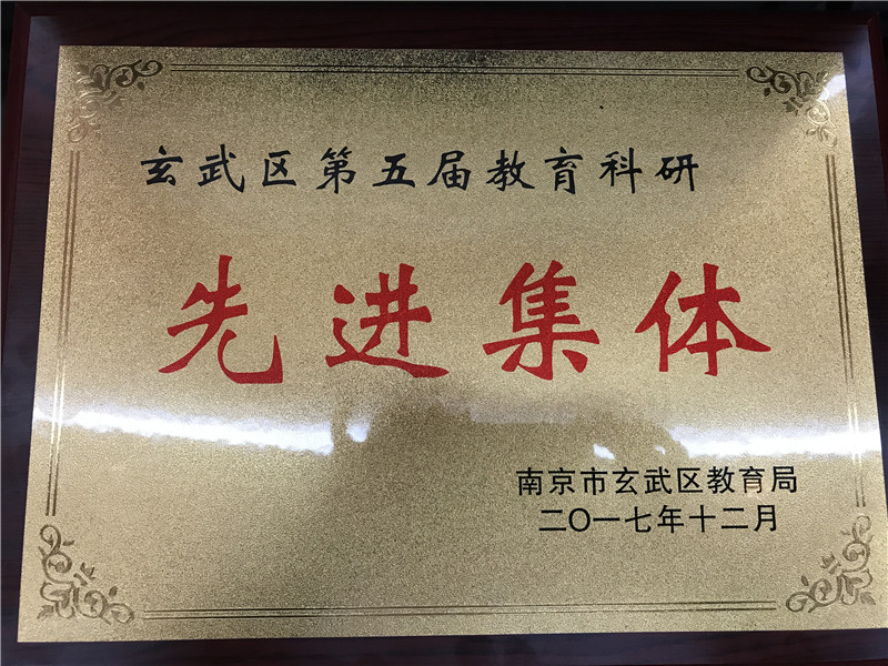 “玄武区第五届教育科研先进集体”。同时,我校的张德举、张蓉、李虎山三位老师荣获“玄武区第五届教育科研先进个人”;张蓉、夏正敏老师获得“玄武区教育科学优秀成果”一等奖,陈俊、马剑老师获得“玄武区教育科学优秀成果”二等奖。