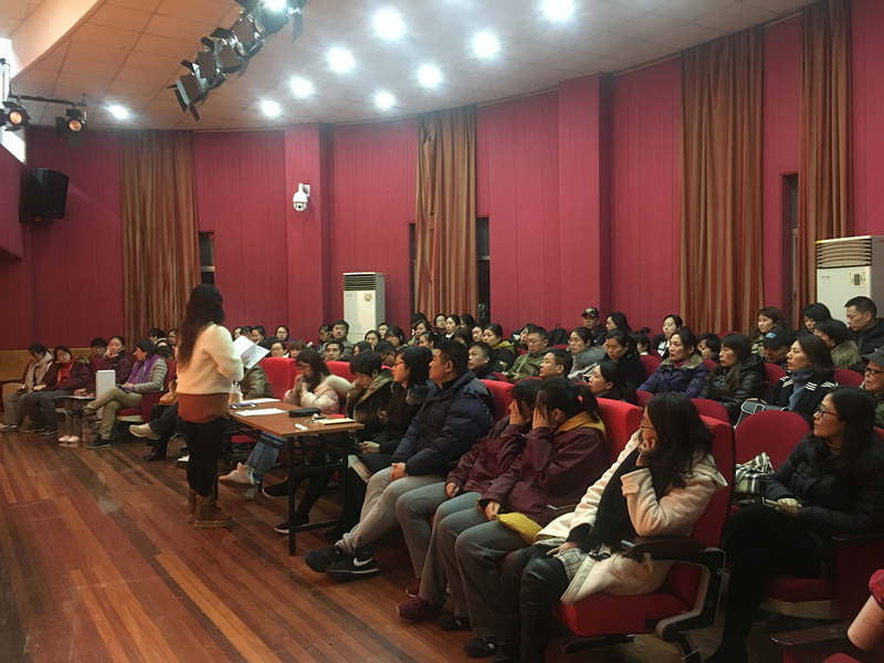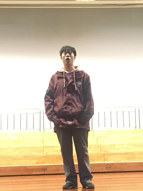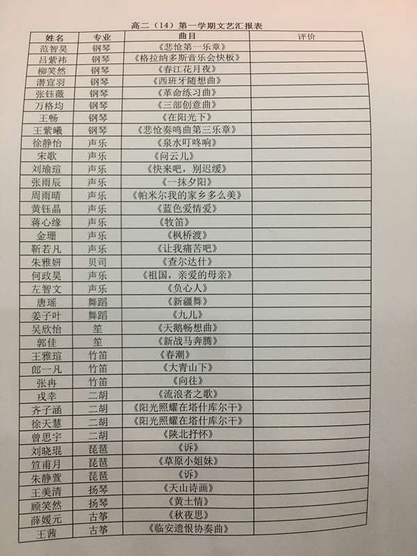 12月20日,尚美楼的演出厅里面座无虚席,阵阵歌声甚至吸引来了刚考完省统考的高三学生们。原来又等到了文艺班同学的汇报演出,出席本次汇报的有文艺中心的四位老师和班主任胡老师,先来看一看高二14班同学们精彩的节目单。