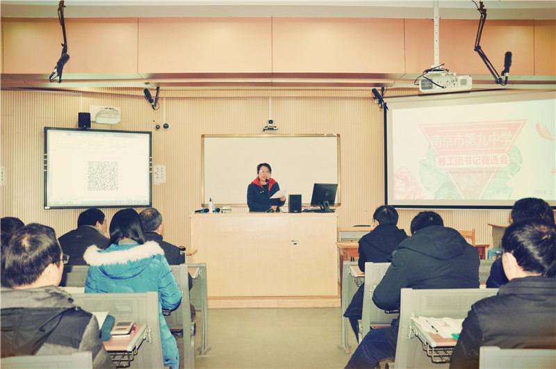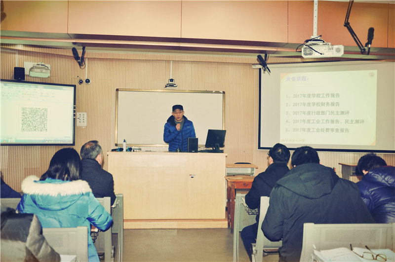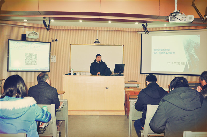 2018年2月3日上午8:30,南京九中十届工会委员会第三次全体会员大会暨学期结束会在庄严的国歌声中拉开帷幕。大会由本届工会主席张伟老师主持。大会议程有以下六部分:1、张恒柱校长作2017年度学校行政报告;2、樊晓鸣校长作2017年度学校财务报告、3、行政中层管理部门述职及民主测评;4、张伟主席进行年度工会工作报告及民主测评;5、工会经审查委主任委员张佩林老师汇报2017年度工会经费审查报告;6、王艳飞校长主持进行学校教工团支部书记的竞选活动。