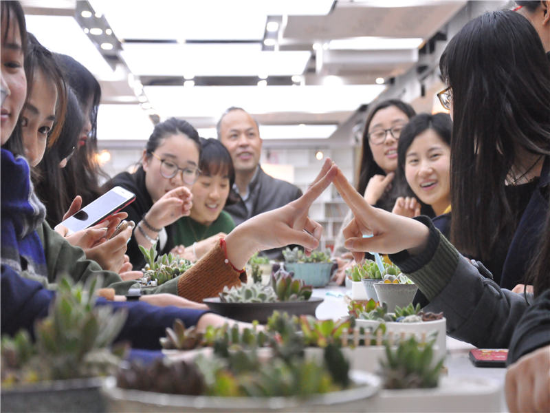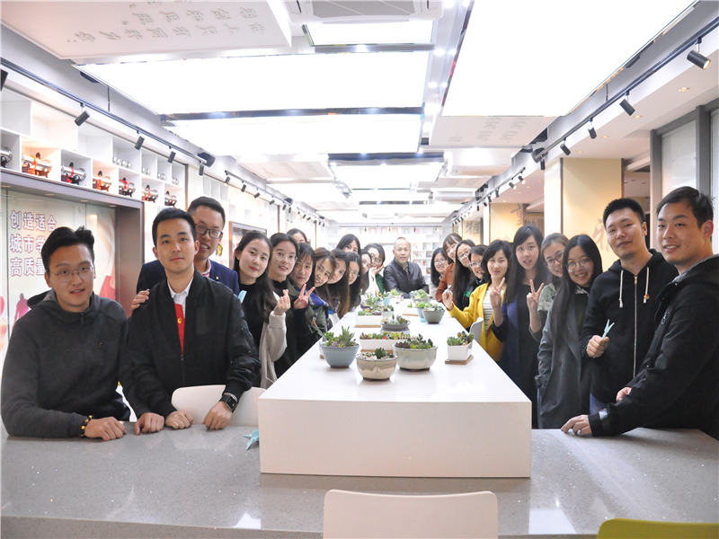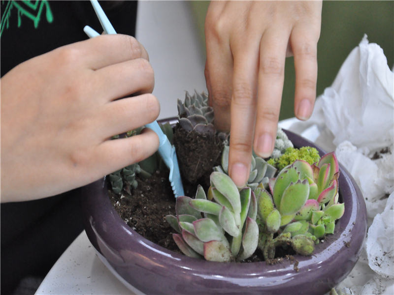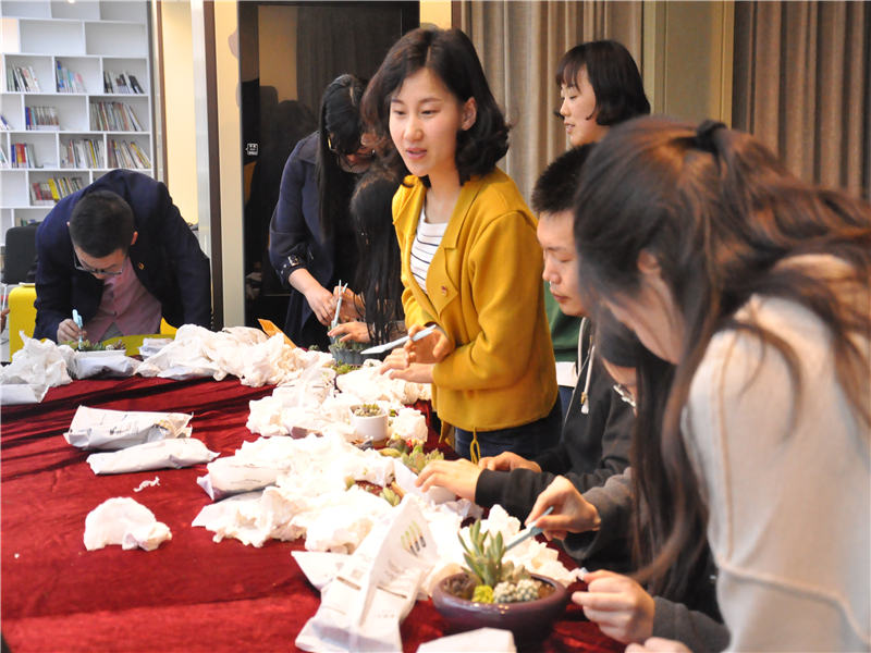 在聆听完校长的寄语之后,教工团成员们一起合作栽培多肉。由于多肉是随机挑选的,可能一个人拿的都是一个品种,这就需要大家互相交换和分享。所有人完成盆栽种植之后,大家投票评出四项大奖:①最佳创意奖——武超老师②最佳巧手奖——孙欢老师③最佳文艺奖——肖亚老师④最佳戏精奖——张小霞老师。