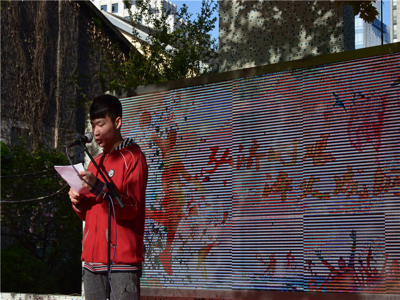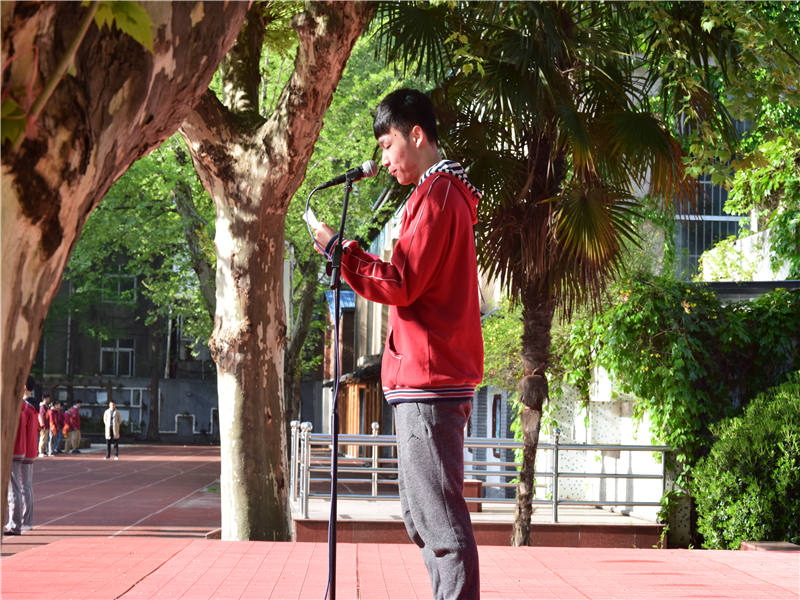 2018年4月9日,南京市第九中学在大操场举行“弘济时艰 淬火成钢”主题晨会,本次晨会由南京市第九中学篮球队队员代表刘博文同学作国旗下讲话。