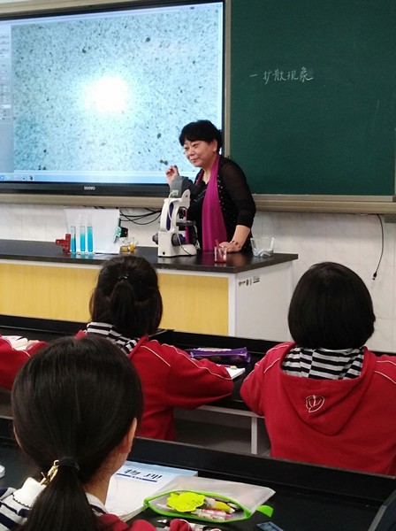 在探究分子运动的过程中,生物杨培红老师带领着学生“穿越”回19世纪,重演了1827年英国植物学家布朗在显微镜下对花粉颗粒的观察过程。张蓉老师在旁配合杨老师,引导学生观察颗粒的运动特点,再现当年布朗换用不同颗粒的研究历程,得出颗粒运动无规则永不停息的结论。