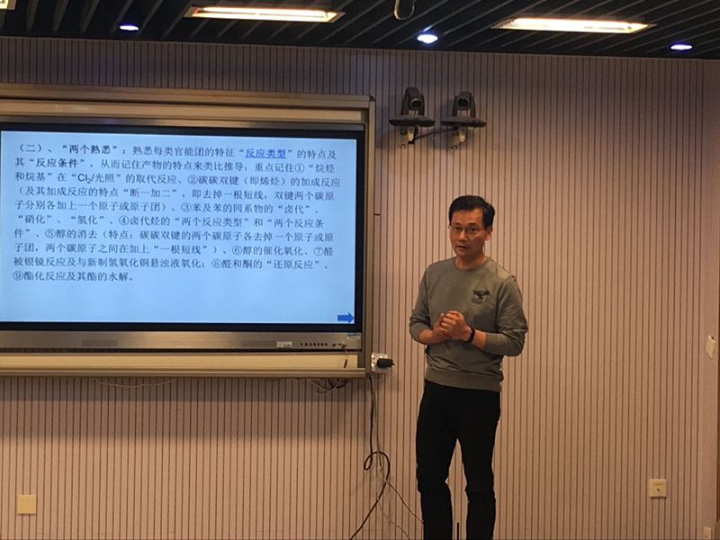 通讯二:5月24日上午9时,在南京市人民中学,九中化学组李虎山老师和李琦老师,参与区教研员陆建源主持的名师工作室的活动。同时,李虎山老师做《谈谈江苏高考化学题中有机题的突破》的讲座汇报。