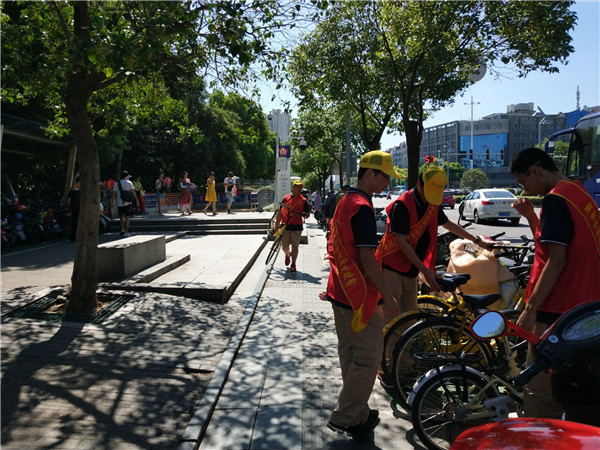 7月12号早上九点,高二(5)班的同学们到达江东门社区,开始了为期2天的志愿服务活动。 在社区工作人员的带领下,小队成员们前往云锦路地铁口,在那进行共享单车的排放。之前看起来稍显凌乱的共享单车在志愿者的排放下变得整齐许多,在排放完成之后,小队成员更是为前往南京大屠杀死难者同胞纪念馆的游客们指路带路。虽然烈日炎炎,但小队成员们都干劲十足。