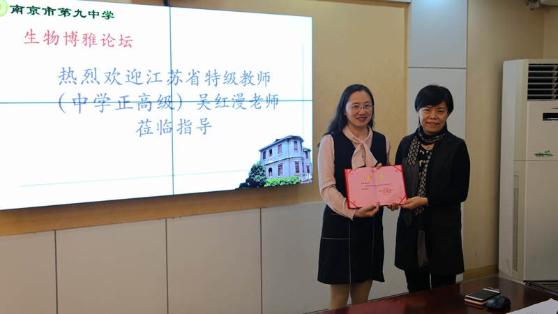 最后,来自扬州大学附属中学的省生物特级教师吴红漫老师与九中生物教研组老师们进行了座谈并进行了题为《依托核心素养落地,寻个人专业成长之路》的讲座。作为生物教学专家,吴红漫老师向大家介绍了最新的生物学科的核心素养、高中生物学科新课标、教学评价新思路等学科知识,对老师们的教学设计新思路提出了许多非常宝贵的建议和要求。并对青年教师的职业发展给予了建议和鼓励。最后,诸谦校长为吴红漫老师颁发了聘书。