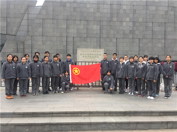 献花结束后,大家又乘车来到了南京大屠杀纪念馆。由于内部闭馆,同学们便在大门口手持团旗,集体为南京大屠杀死难者哀悼。许多经过的路人也为同学们的一份爱国之情所打动。纷纷举起了手机,记录下这有意义的、感人的一刻。